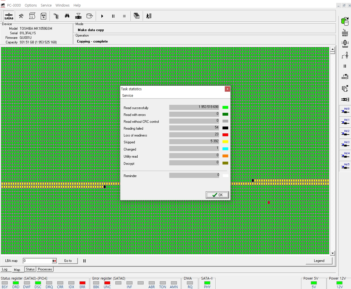 디스크 노후화로 인하여 디스크 내부 BADSECTOR가 미미하게 발견되었으나 최대한 엑세스 하여 2차 덤프작업 마무리 후 데이터 추출