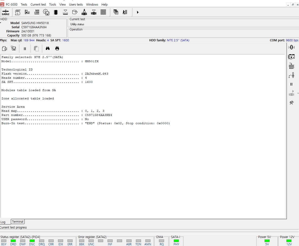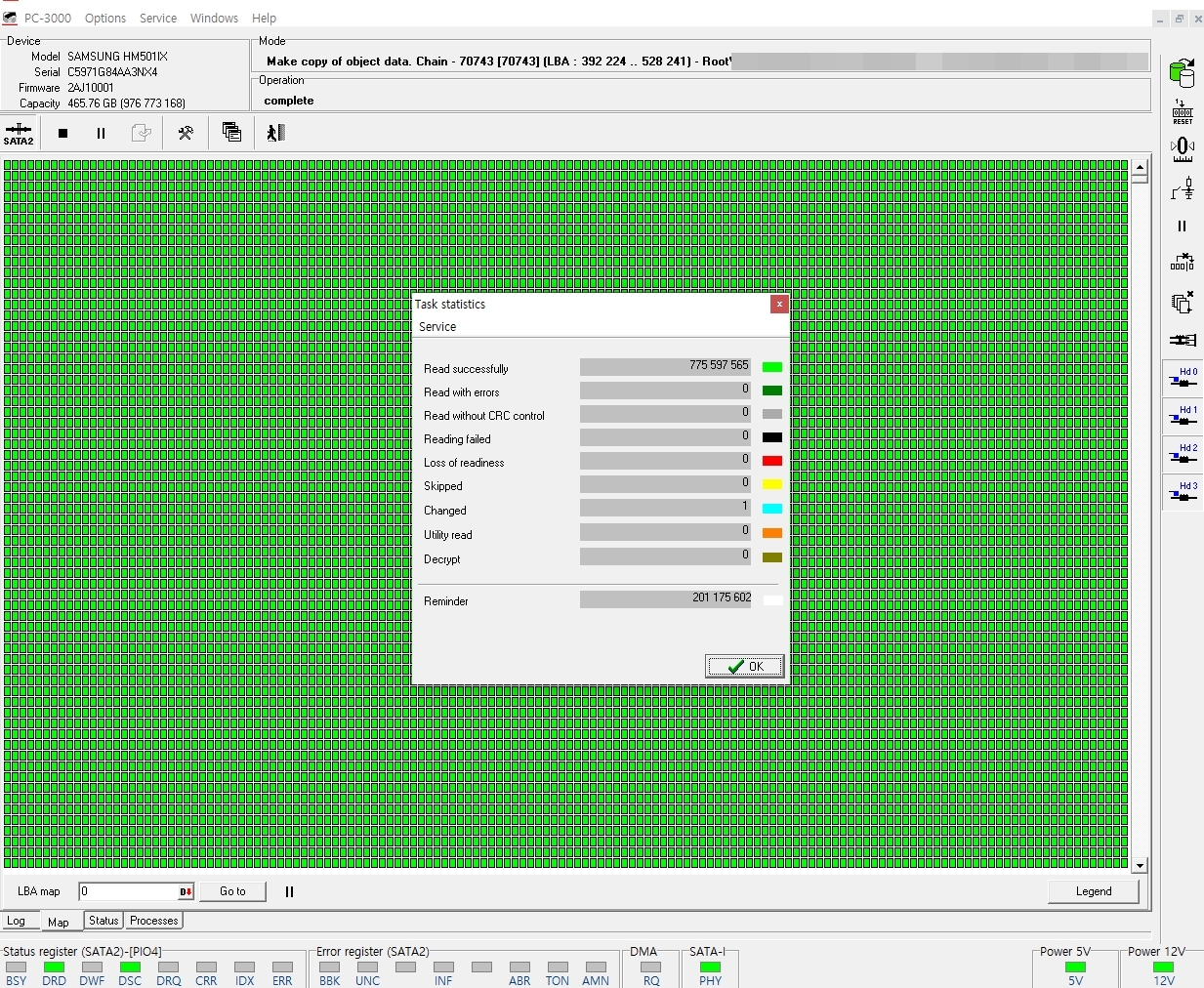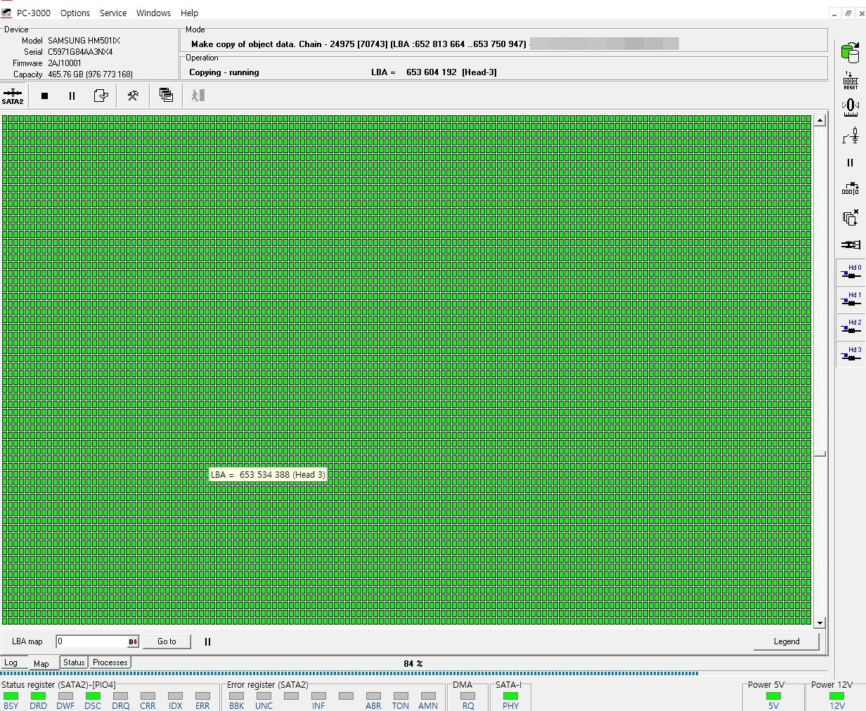 접수된 외장하드의 헤드가 정상적으로 구동이 되는지 헤드맵을 체크하여 어느섹터를 관장하는지 확인 후