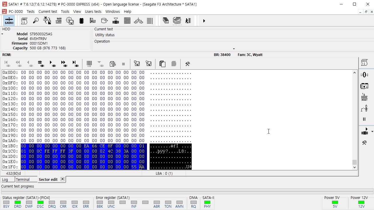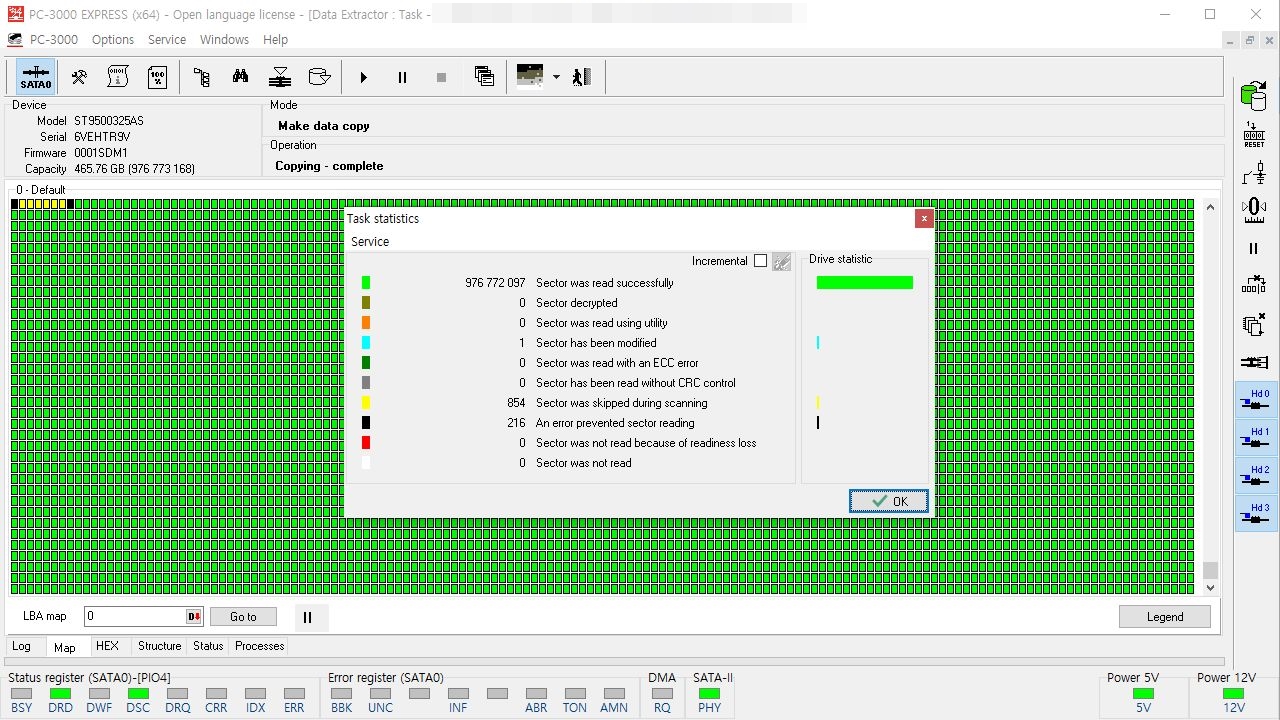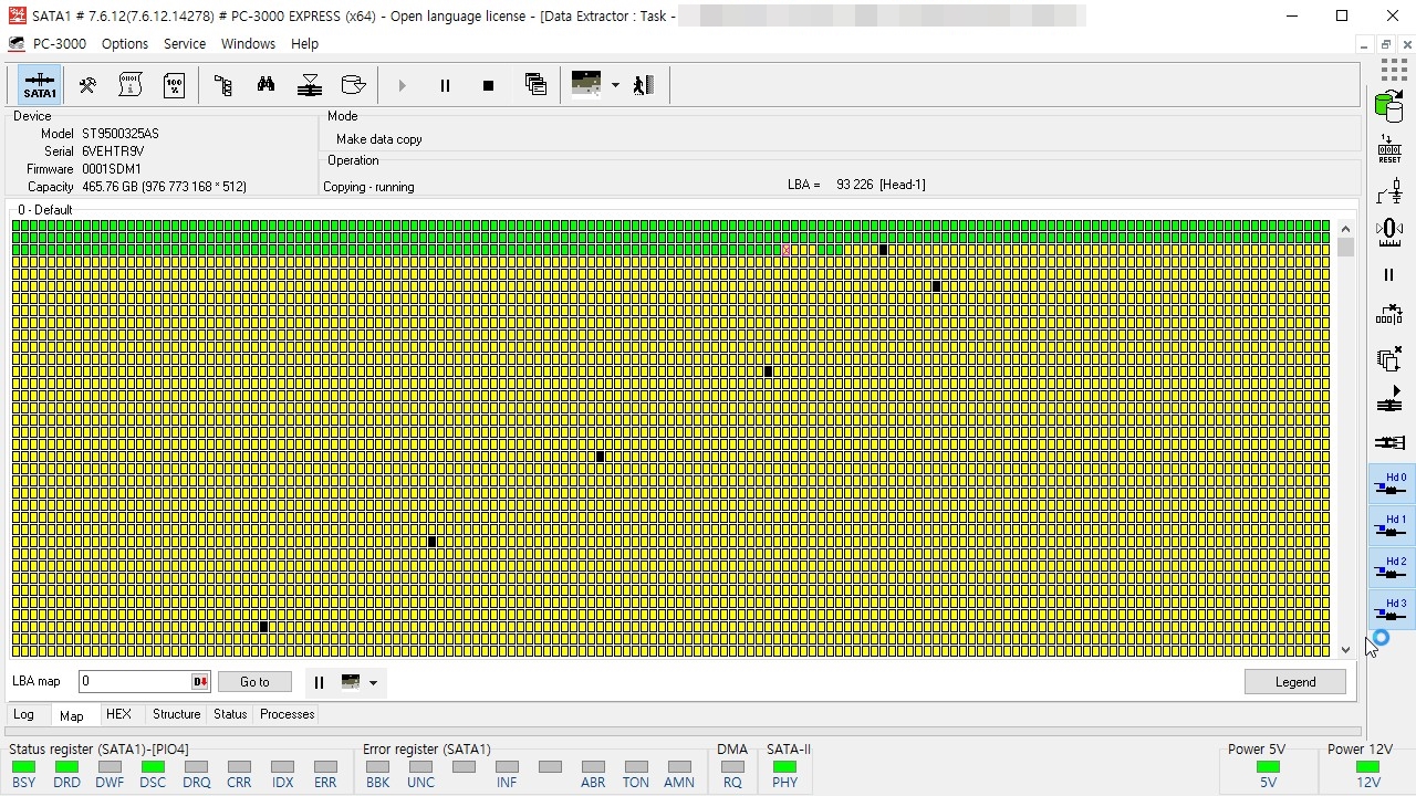 복구장비인 PC-3000E에 연결하여 전원을 공급하였을때, 모터회전까지는 무난하였고 드라이브 아이디까지 출력.