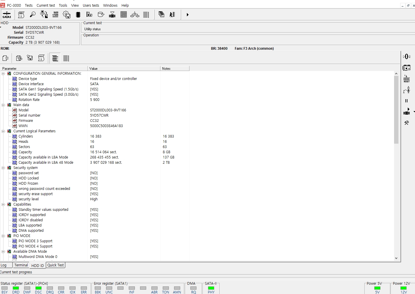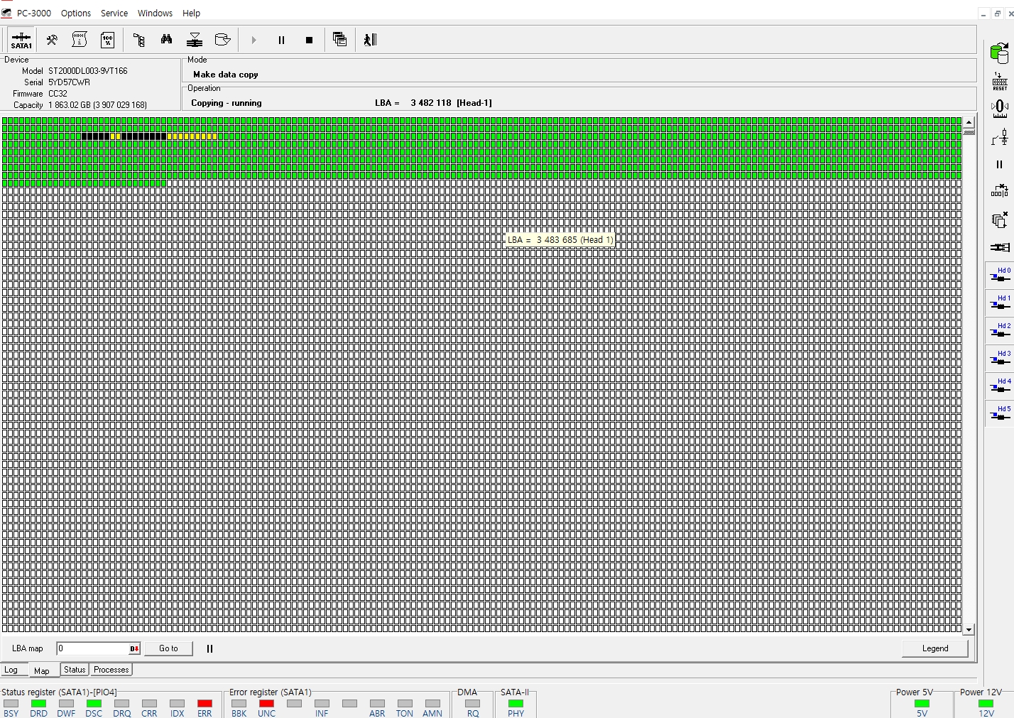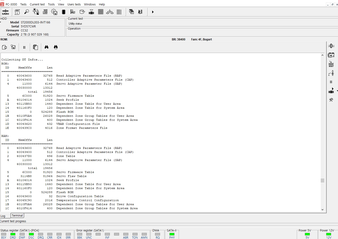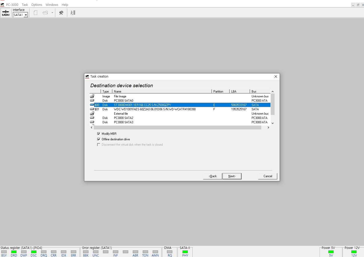 접수된 하드디스크를 복구장비인 PC-3000E에 연결하여 유틸리티 모드를 실행