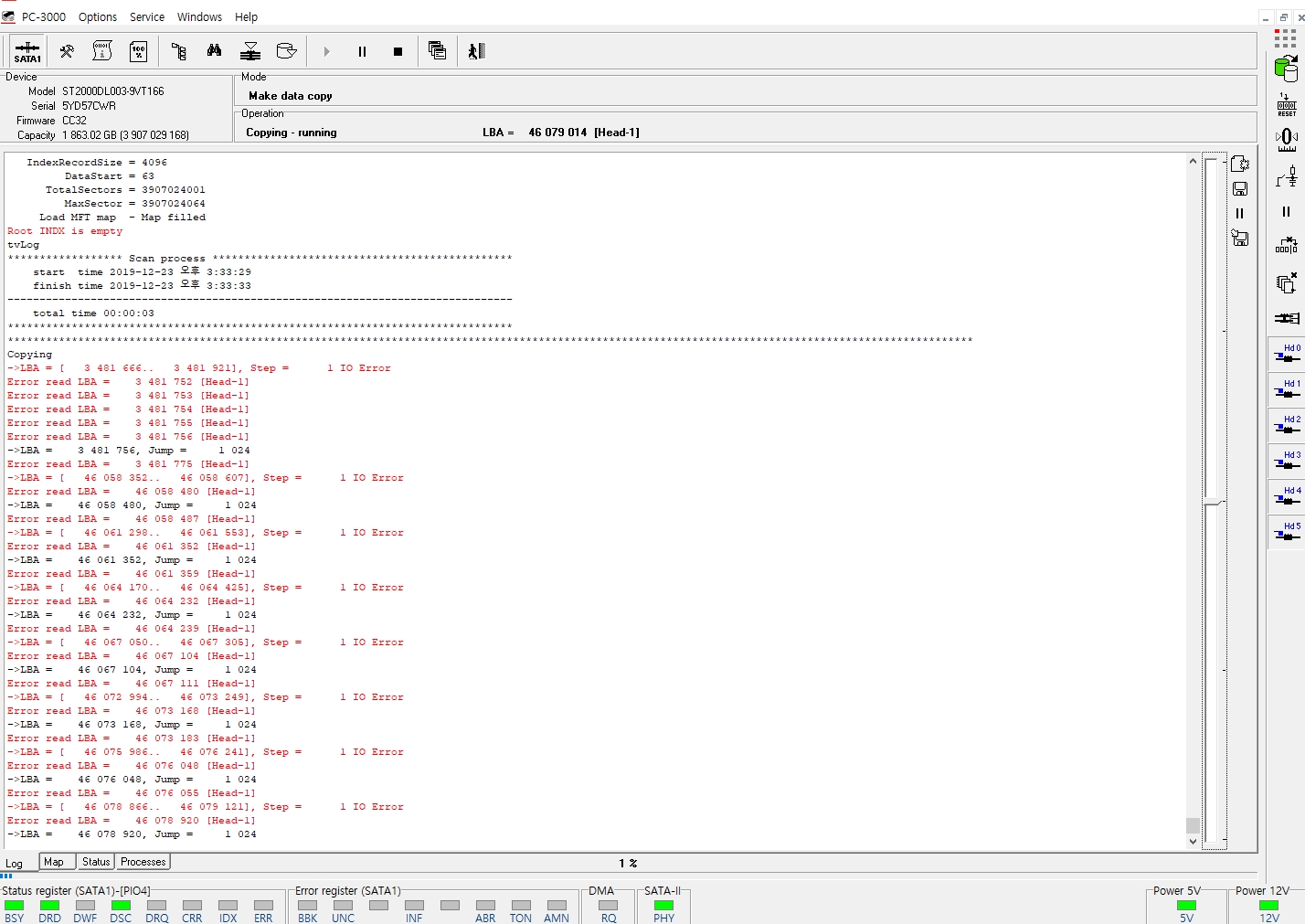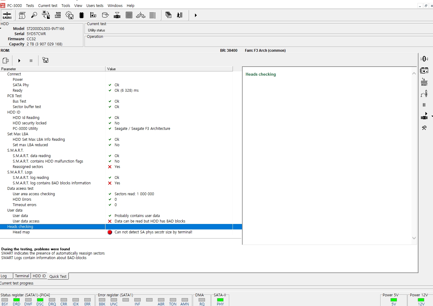 하드디스크를 직결로 연결하니 포맷하라는 메세지가 출력되었고 복구장비인 PC-3000E에 연결하여 테스트해보니 BAD존재 확인