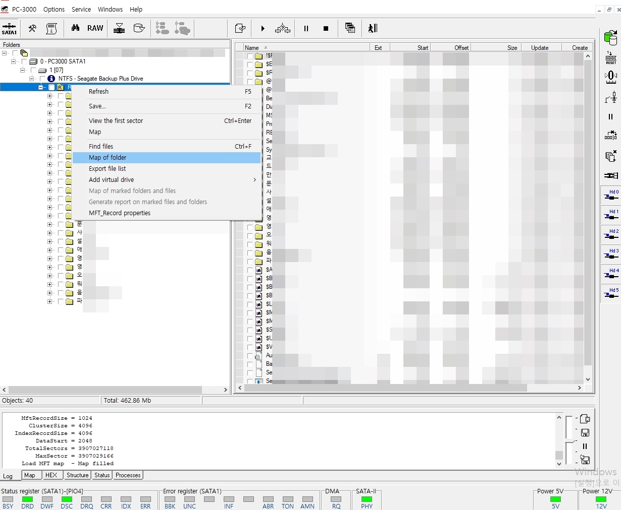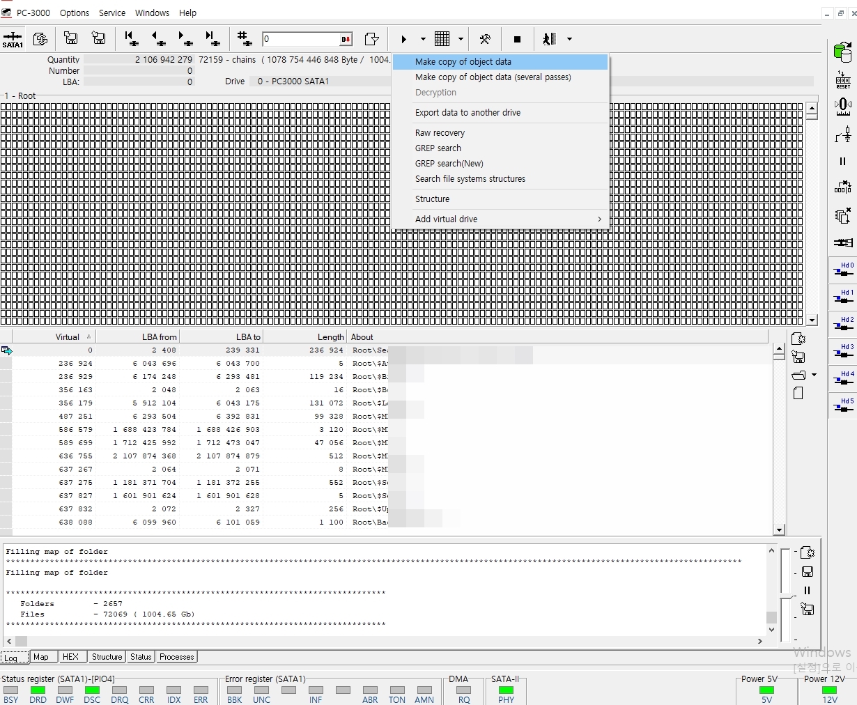 디스크 해드맵을 체크하여 3쌍의 해드의 관할영역을 확인하고 데이터 폴더구조를 확인