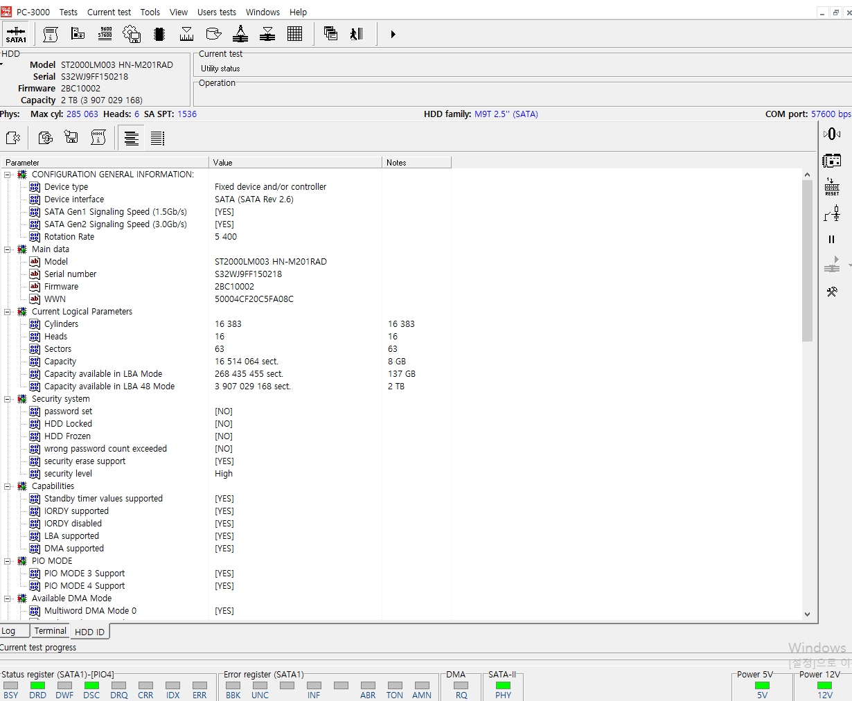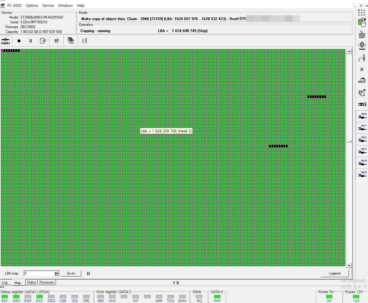 4.복구장비인 PC-3000E를 통하여 전원을 공급하여 디스크 인식하는데에 성공