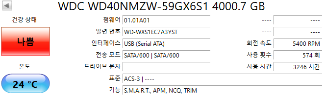 - 외장하드가 현재 인식은 되는 상태이기 때문에 커버를 열지 않음